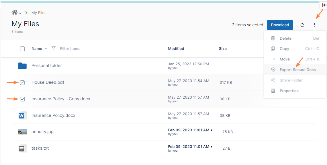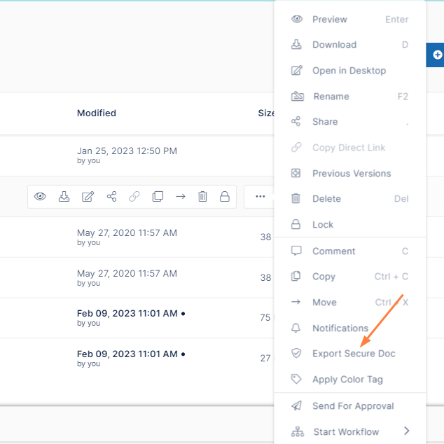 - In the upper-right corner of the screen, click the More icon and choose Export Secure Docs.