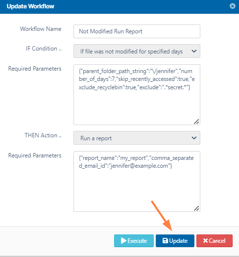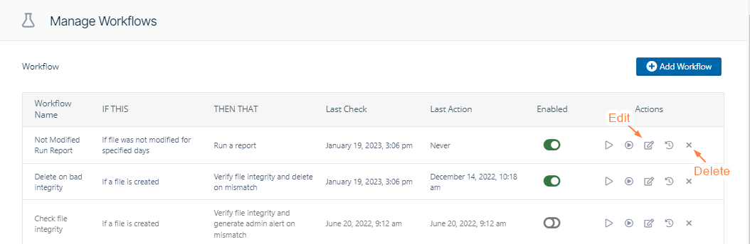Administrators can edit workflows to change the name or parameters of the conditions and action.