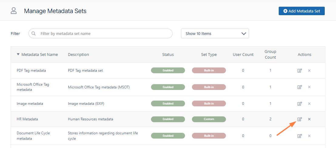 In the row of the set you want to edit, under Actions, click the edit button (). The Edit Metadata Set dialog box opens.