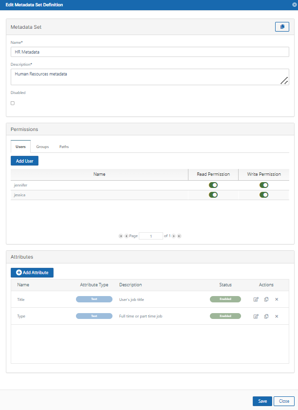 Once changes to the metadata set definition are saved the background process runs, which propagates changes made to the set definition to metadata_values collection that stores user provided attribute values. This is done to keep both collections in-sync and to increase performance for end-user metadata actions. Metadata info properties (name, description, status) are updated, permissions are omitted as they're not used in the metadata_values collection and the main task is to keep attributes in sync. There are three main use cases that are served by the task: