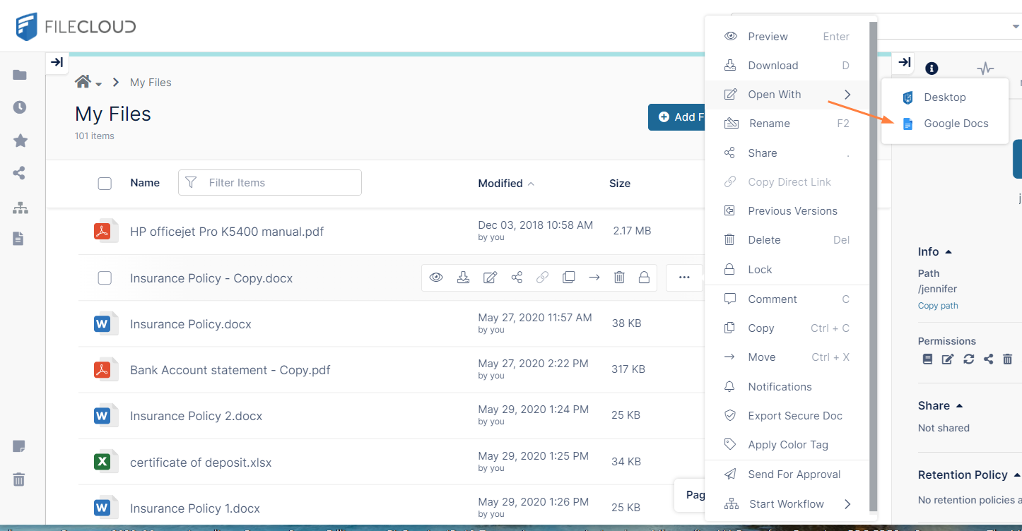 Beginning with FileCloud 21.3, you may also have the option of web editing Office files in Google Apps applications. If editing in Google Apps is set up in your FileCloud system, you can edit docx, xlsx, and pptx files in the corresponding Google Docs, Google Sheets, or Google Slides application.