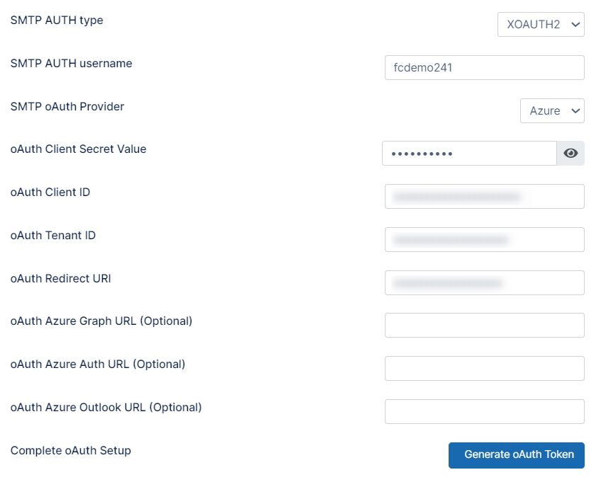 Fill in the SMTP oAuth fields on the Email Settings page listed in the table below: For the fields oAuth Client Secret Value, oAuth Client ID, oAuth Tenant ID, and oAuth Redirect URI , retrieve the values from portal.azure.com after registering the oAuth application.