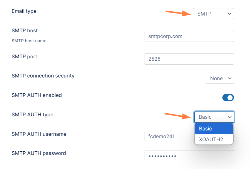SMTP Auth Type may be Basic or XOAUTH2. The option you choose determines which additional SMTP fields follow.