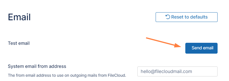 In the FileCloud admin portal's left navigation bar, scroll down and clickSettings.Then, on the Settings navigation page, click Email . TheEmail settings page opens. The general settings on the page begin with System email from address and go through Email type, as shown in the screenshot below.