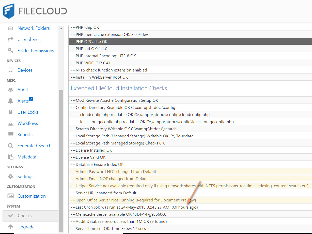 - Open the admin portal for the specific site; click Checks and verify that the cron job was run recently.