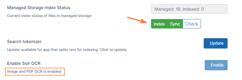 You have finished enabling image and PDF OCR. - To build or rebuild the search index with OCR for images with text and PDFs, under Managed Storage Index Status,