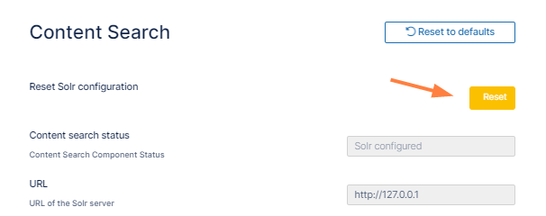 The Content Search settings page opens. - Click Reset to reset Solr configuration.