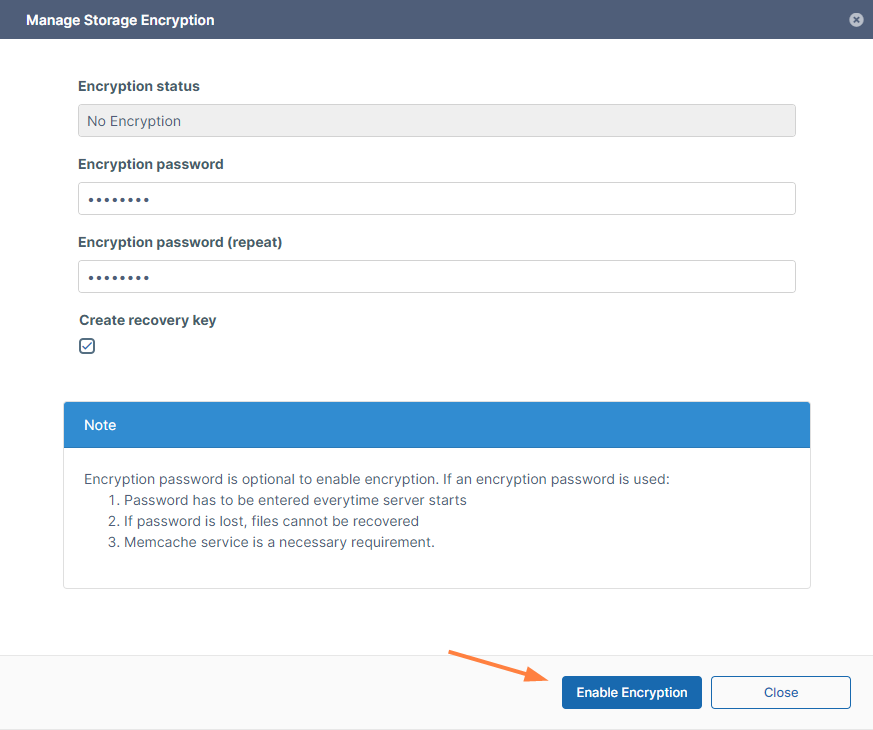 To perform the necessary initialization of the encryption module, click Enable Encryption.