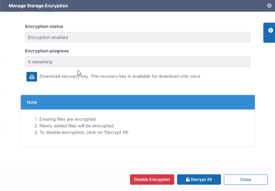 If the recovery key option is selected, the recovery key file becomes available only once for download.