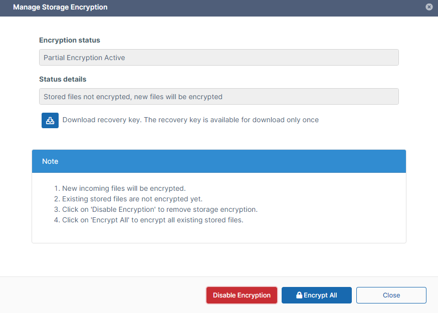 Now the Encryption status indicates that partial encryption is active. Status details indicates that files already stored in the system are not encrypted, but new files will be encrypted.