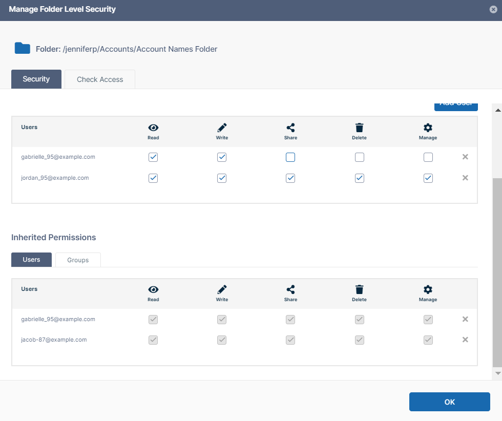 - Subfolders inherit the folder-level permissions of their immediate parent folders.