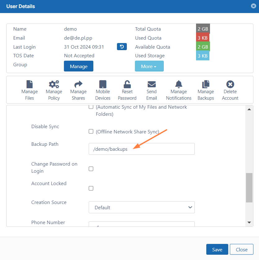 You can override this path for specific users to have them back up to a different location in the User Details screen (see below).