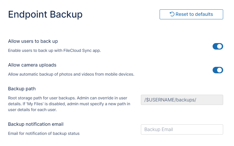 Allow mobile clients to automatically back up photos and videos to their FileCloud accounts. Turning off this setting prevents this server from being used to back up audio/video files.