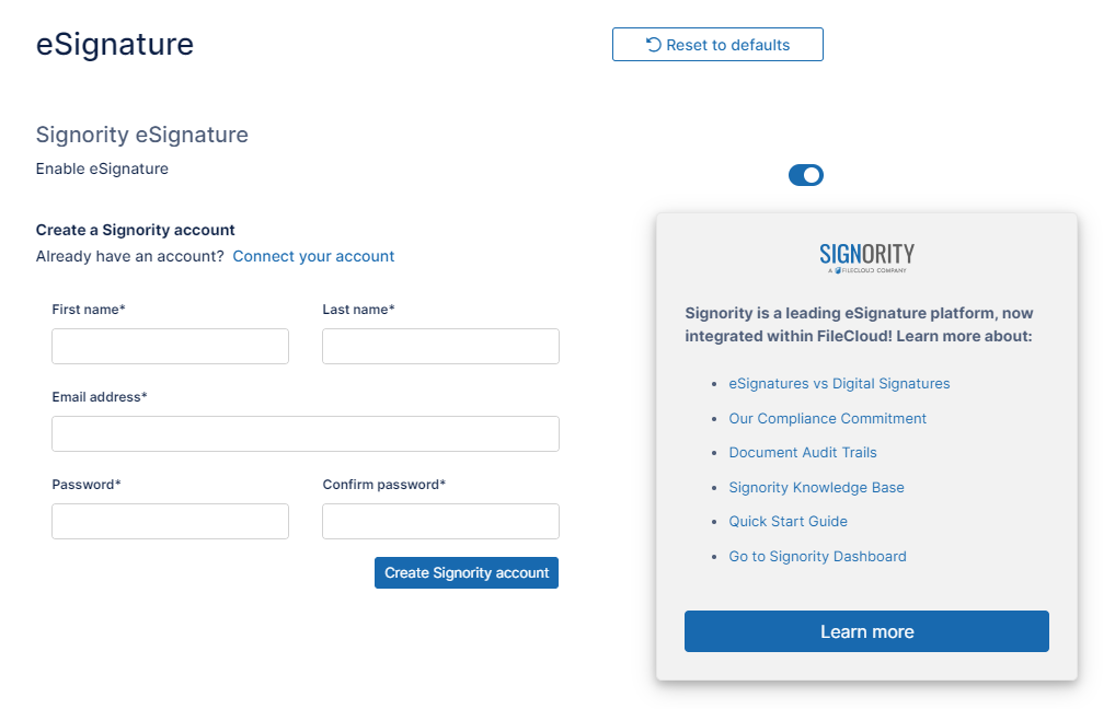 Enable the Enable eSignature setting. Fields for creating a trial Signority Account appear along with the link Connect your account for users who already have accounts.