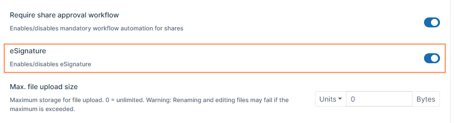 eSignature must be enabled in a user's policy for the user to be able to use the eSignature feature. By default, the feature is enabled in all policies.