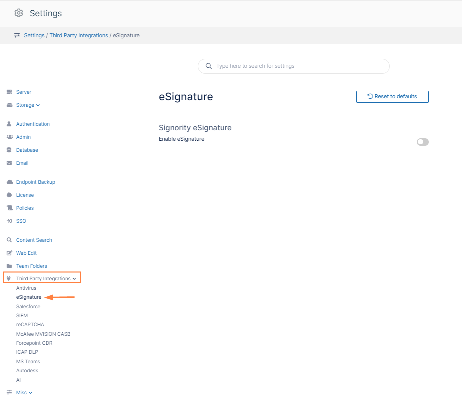In the inner navigation bar on the left of the Third Party Integrationspage, expand theThird Party Integrationsmenu, and clickeSignature, as shown below. The eSignature settings page opens.