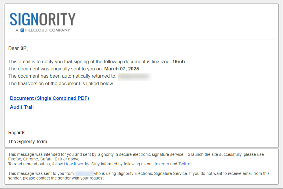 However, since this email is sent from Signority, you can log in to Signority to configure whether or not the audit trail is sent as well as whether multiple signed documents are combined into a single PDF.