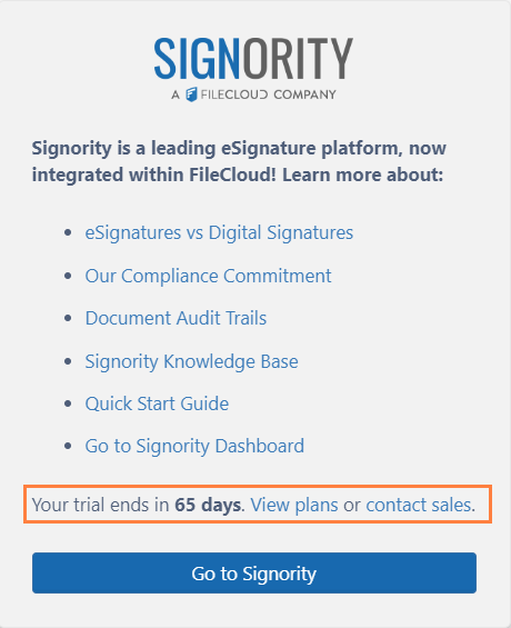 The eSignature screen includes Signority box that keeps count of the days remaining in your trial account and gives you links for viewing Signority account plans or contacting Signority sales: