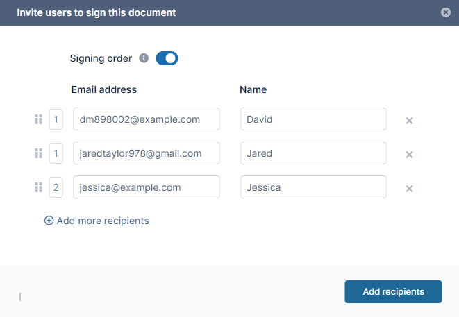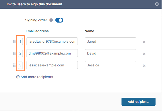 When you initially enable Signing order, recipients are assigned numbers in the order in which they appear:
