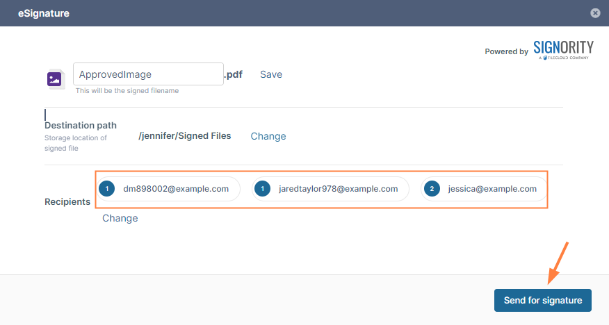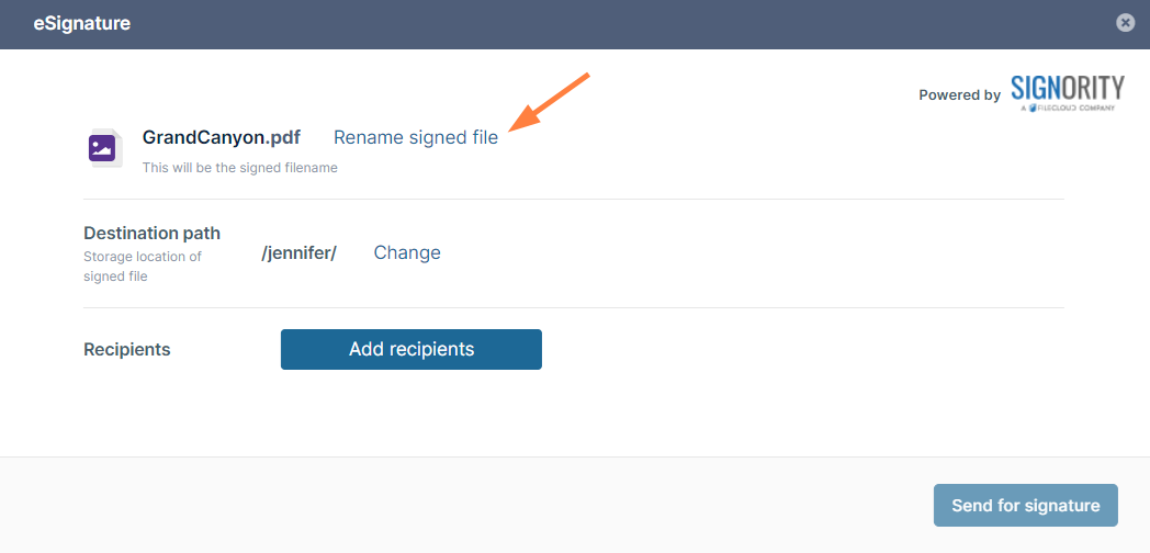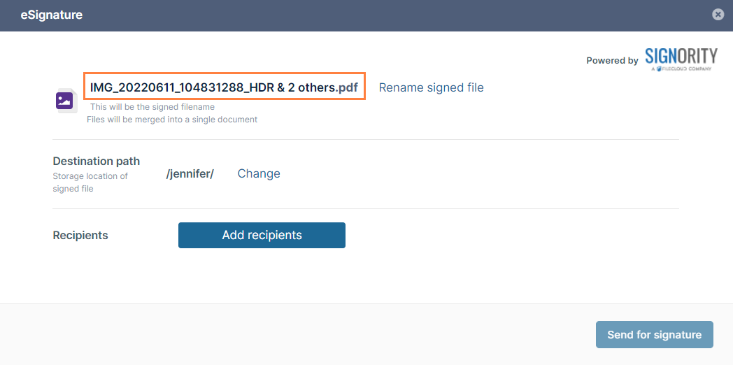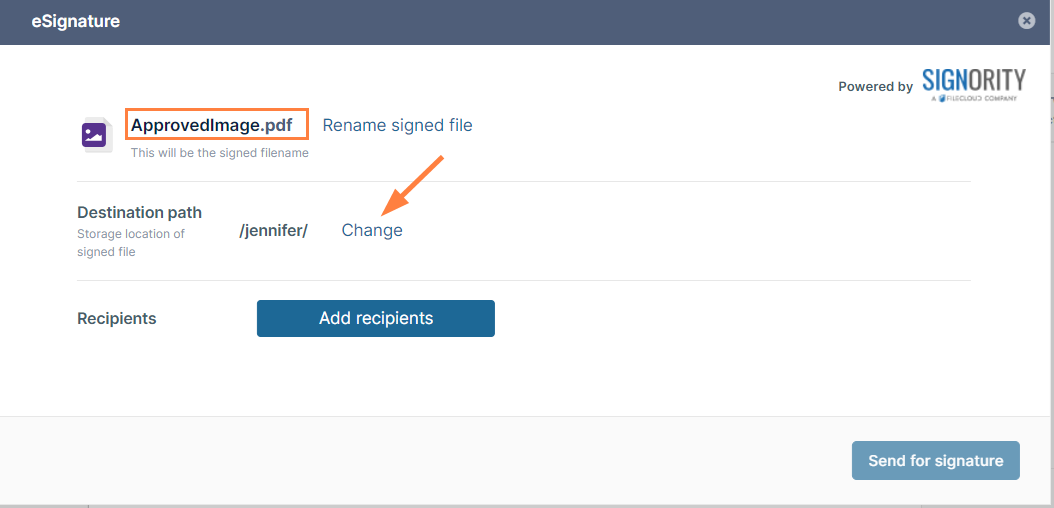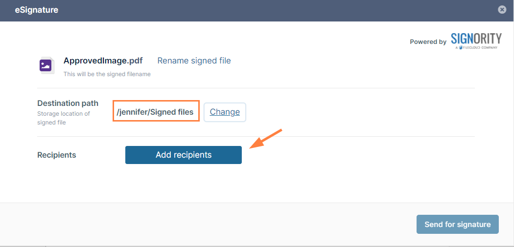 The new destination path is saved. - To add recipients to the signature request, click Add recipients.
