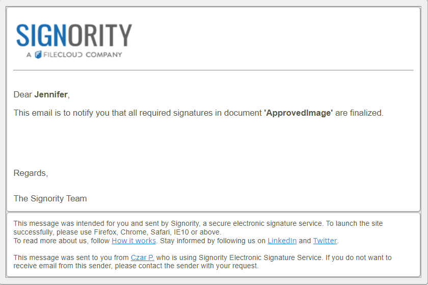 Each recipient also receives an email informing them that signing of the document has been finalized. Depending on the way your admin configures notifications in Signority, the email may contain links or attachments of signed documents and may contain audit trail files.