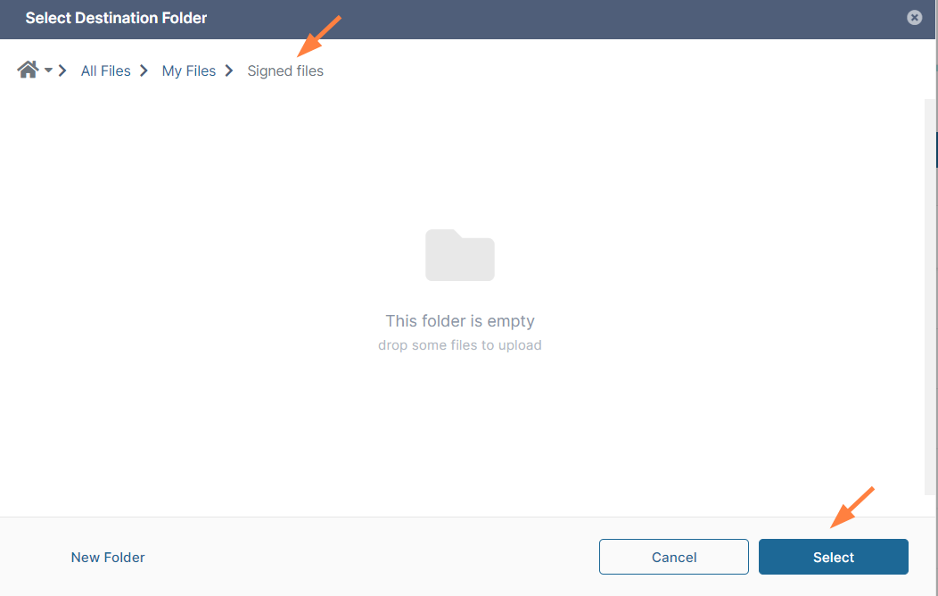 - Navigate to the folder where you want to store the signed eSignature document and click Select.