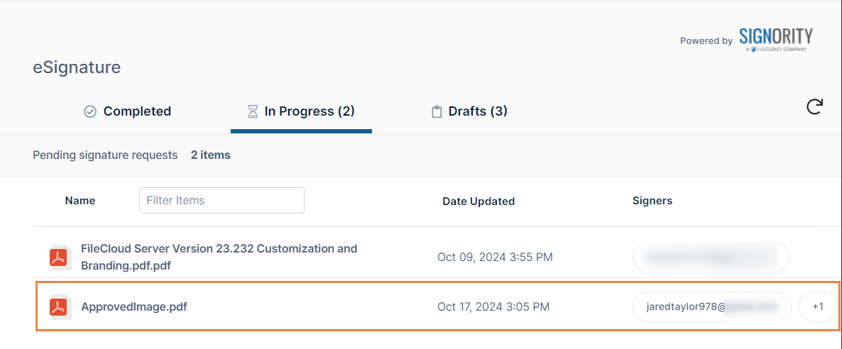If eSignatures are enabled in your FileCloud system, you can choose a file or group of files to send for eSignatures. In FileCloud, the eSignatures process uses the Signority platform, which helps you set up your documents for eSignatures and send them to recipients. The signed documents are returned to your FileCloud account where you can continue to process them.