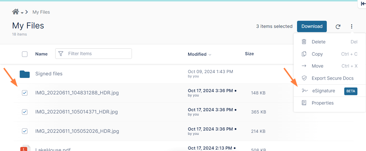 - Check the files that you want to send for signatures, and click the More icon in the upper-right corner of the screen and choose eSignature.
