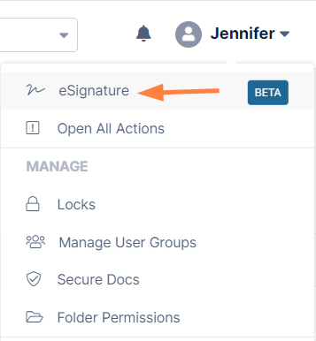 - In FileCloud, to go to the eSignature screen. in the user drop-down list, click eSignature.