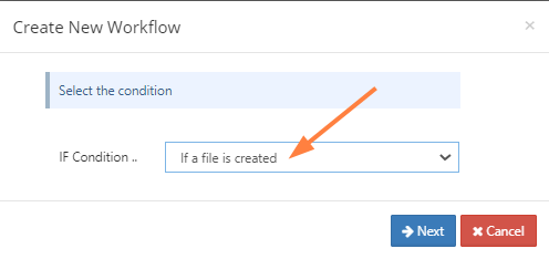 The Create New Workflow dialog box opens. - To perform the check on every file that is uploaded for the first time, in the IF Condition drop-down list, choose If a file is created.