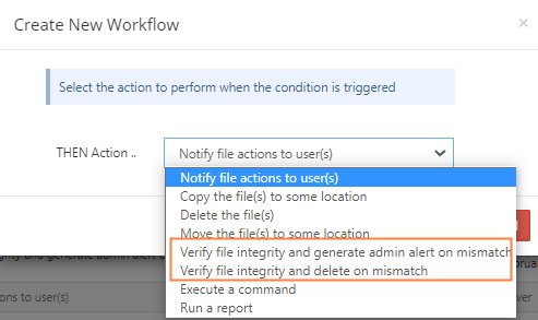 Verify file integrity and delete on mismatch: Detects the mismatch, adds an entry to the Alerts screen of the admin portal, and deletes the file from FileCloud. An audit entry is added in the admin portal to indicate that the file has been deleted by the workflow.