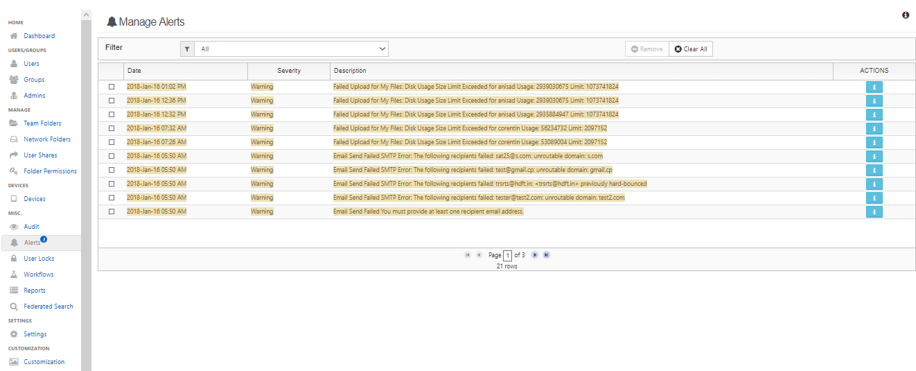 This page tracks all unhandled exceptions, system error messages generated in FileCloud. The number of alerts are shown in the Dashboard and the Alerts page will show detailed information about the various errors encountered.