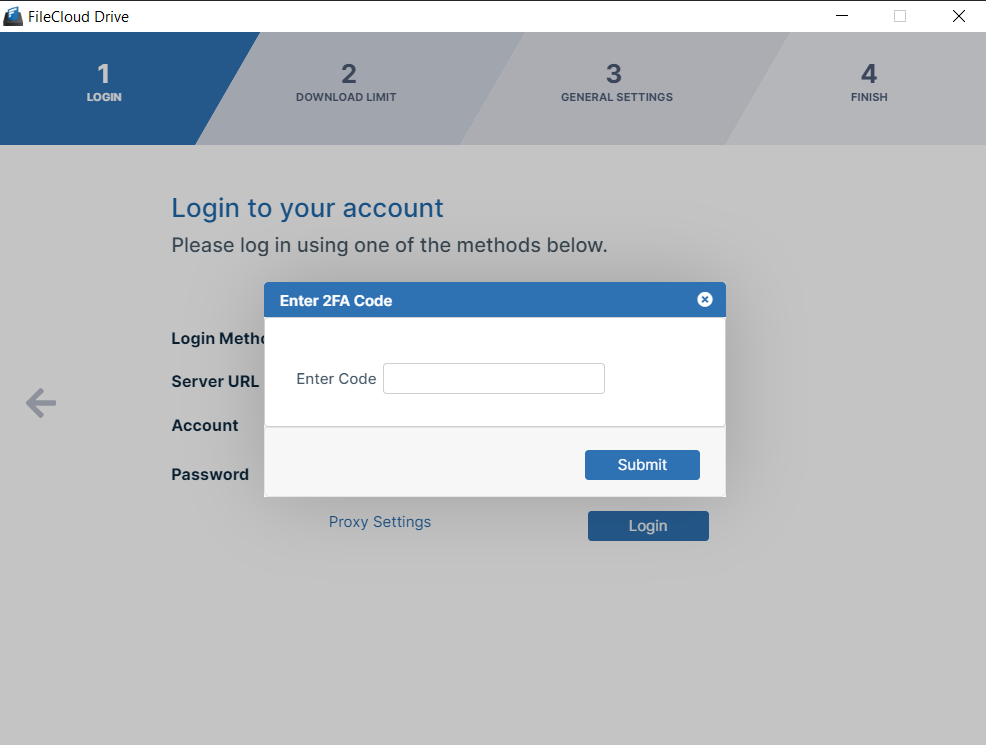 • On subsequent logins to FileCloud Drive the user is prompted to enter a new 2FA code.