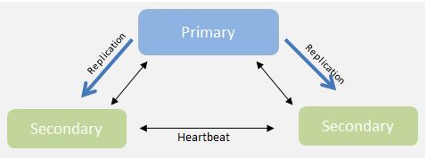 MongoDB database replica sets provide high availability with automatic failover support. Failover allows a secondary member to become primary in the event of failure to the primary DB node. The minimum number of DB nodes needed for MongoDB is three. All app server nodes connect to the primary node, and in the event of primary node failure, a new primary is elected and all the app server nodes will switch to the new primary.