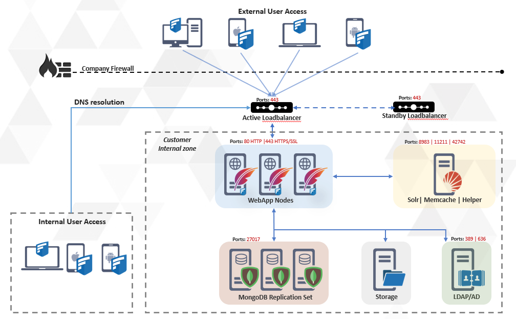 The FileCloud app server node consists of the Apache webserver as well as the FileCloud Application code to serve the client requests. The FileCloud app server nodes do not contain any application-specific data. The data is retrieved from the MondoDB replica sets. Because of this, the FileCloud app server nodes can be added or removed without disrupting the service.