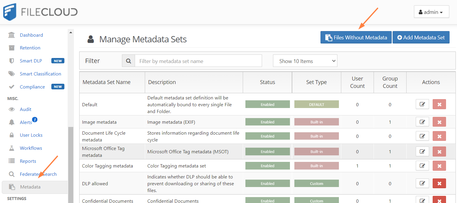 Now the upper-right corner of the Manage Metadata Sets screen displays a Files Without Metadata button.