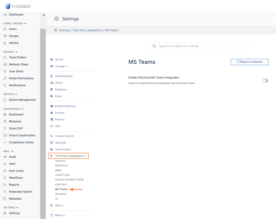 After FileCloud configuration in MS Teams has been completed by a Teams administrator, a FileCloud administrator must enable FileCloud/MS Teams integration in the FileCloud Admin portal.