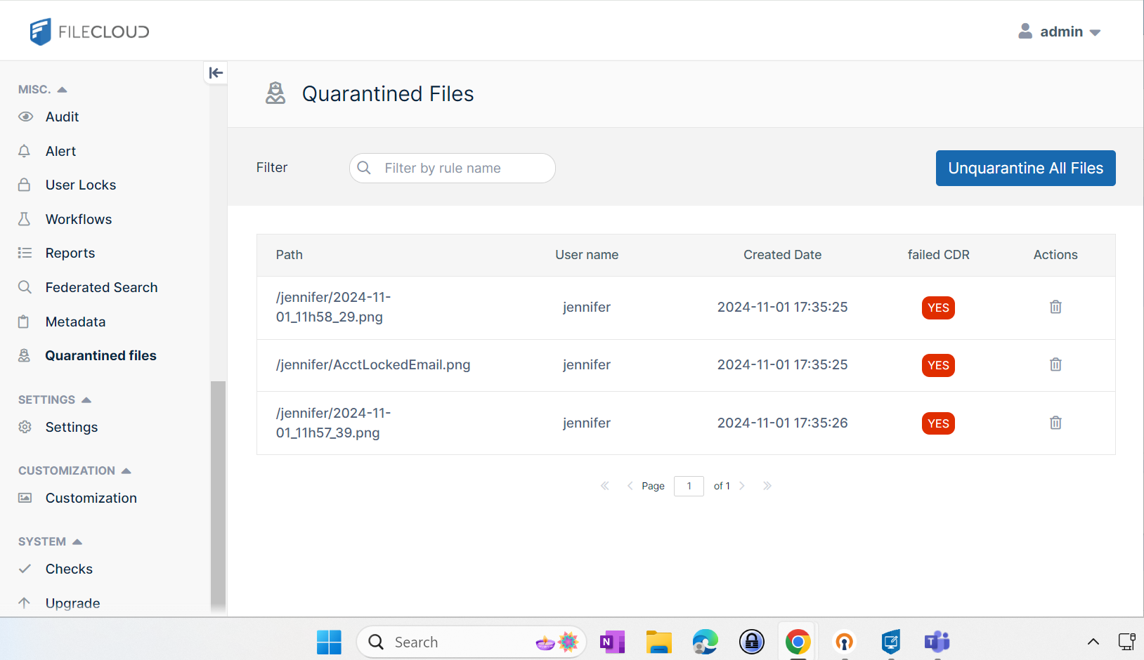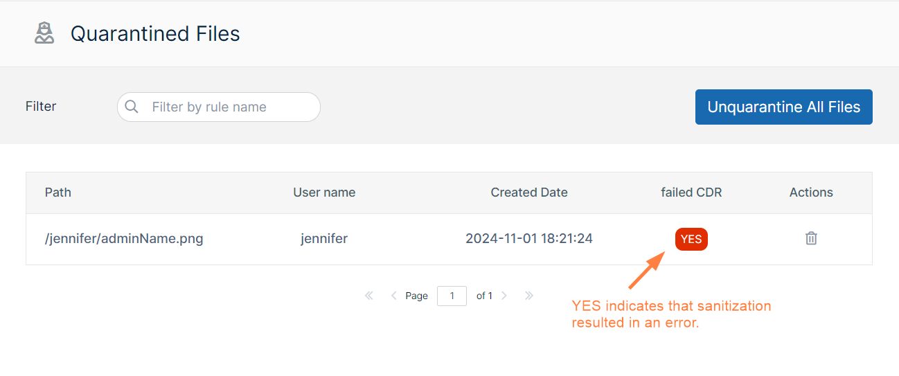 - Files that cannot be sanitized due to an error are repeatedly resent for sanitization until it is successful or the admin goes to the Quarantined Files page and either deletes the non-sanitized file version or removes it from quarantine.