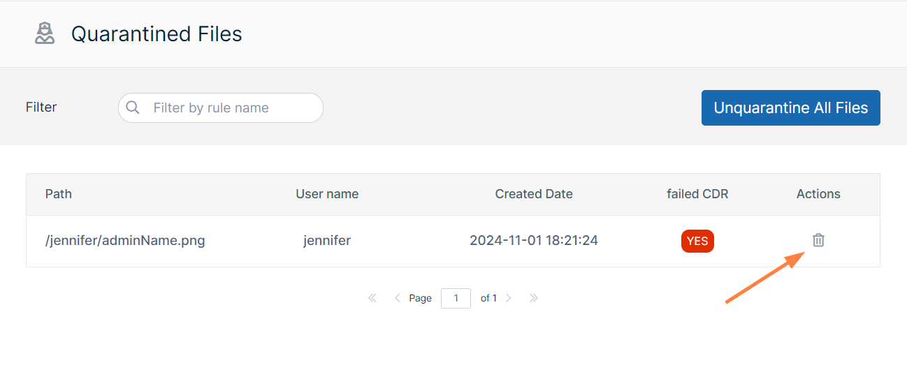 - To delete a file version (a sanitization request) stuck in quarantine, in the Actions column, click the Delete icon.