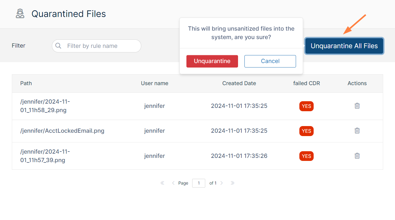 A confirmation box that warns you that unsanitized files will be brought into the system pops up. - If it is okay for the files to remain unsanitized, click Unquarantine in the confirmation box.