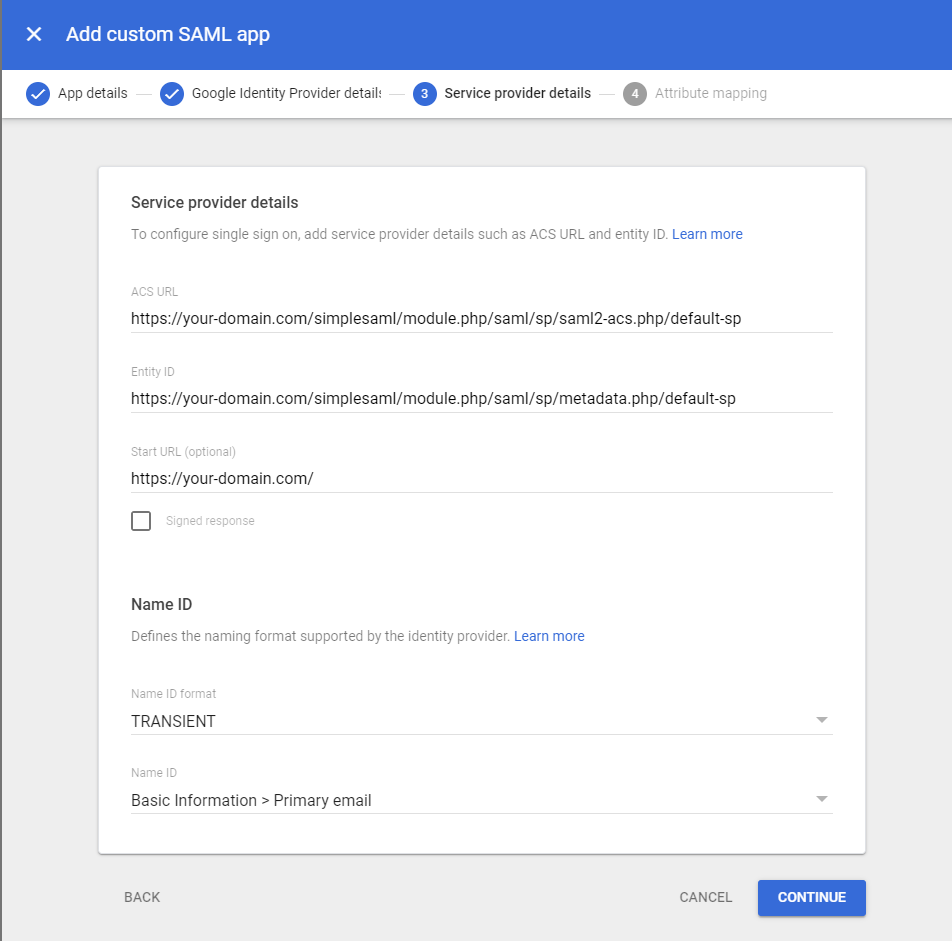ACS URL: https://your-domain/simplesaml/module.php/saml/sp/saml2-acs.php/default-sp