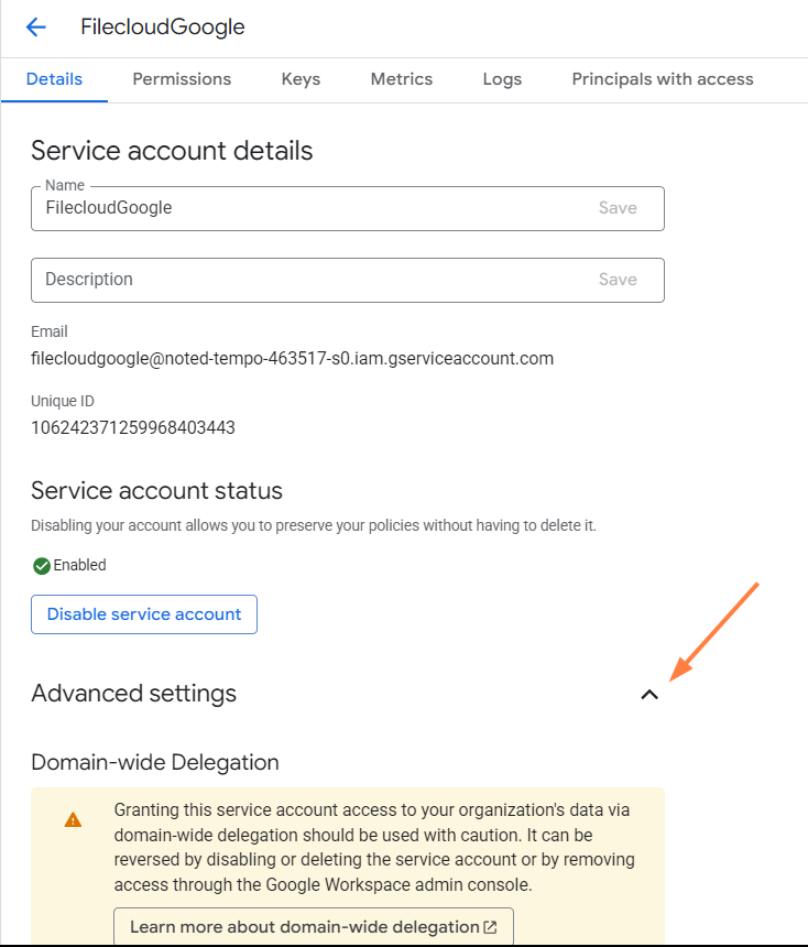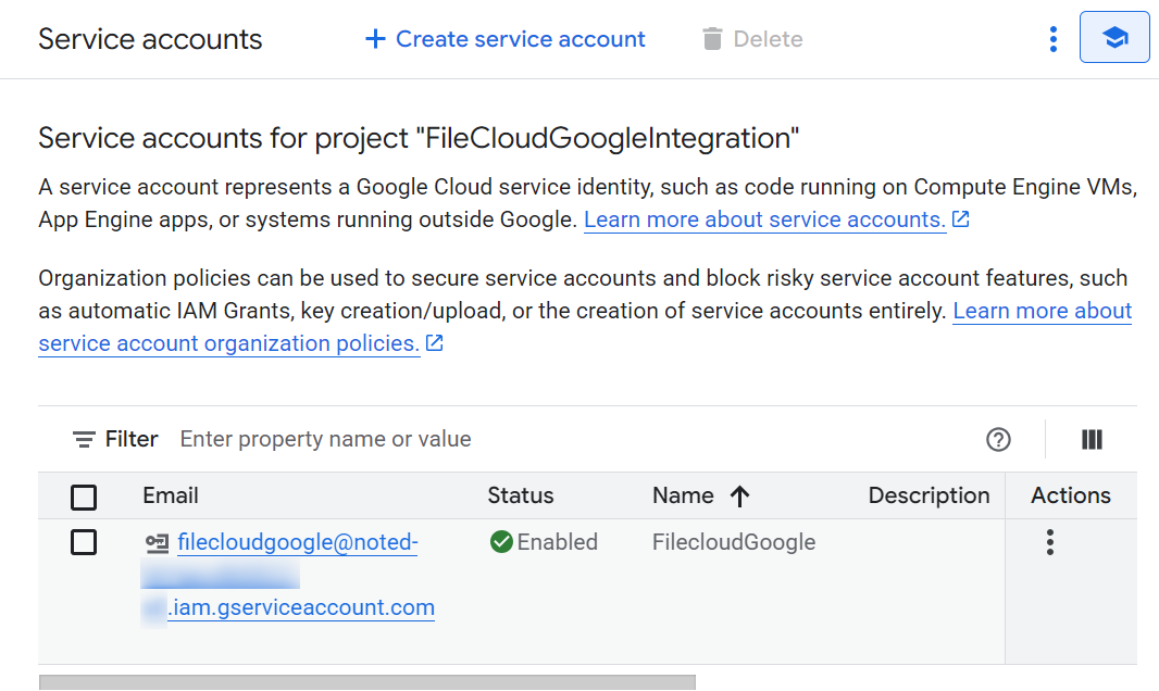 On the Service accounts page, click the service account you created.