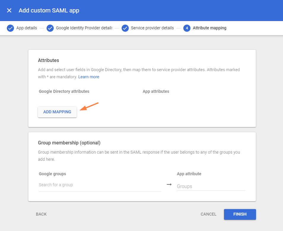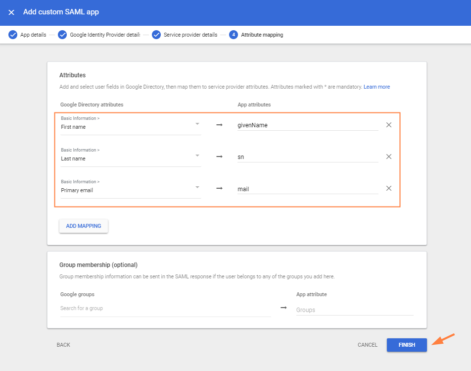 - Choose the Google Directory attributes below, and add the specific values shown to App attributes. Then click FINISH.