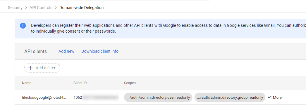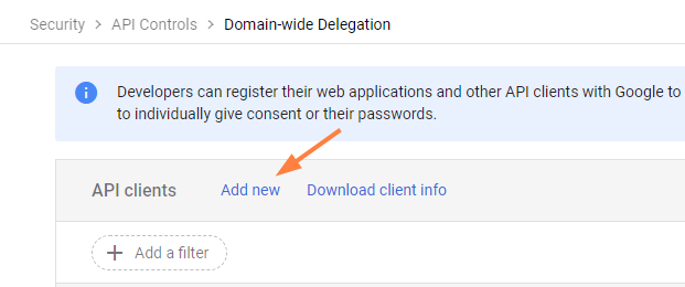 - Log back into Google Workspace Admin Center and go to https://admin.google.com/ac/owl/domainwidedelegation.