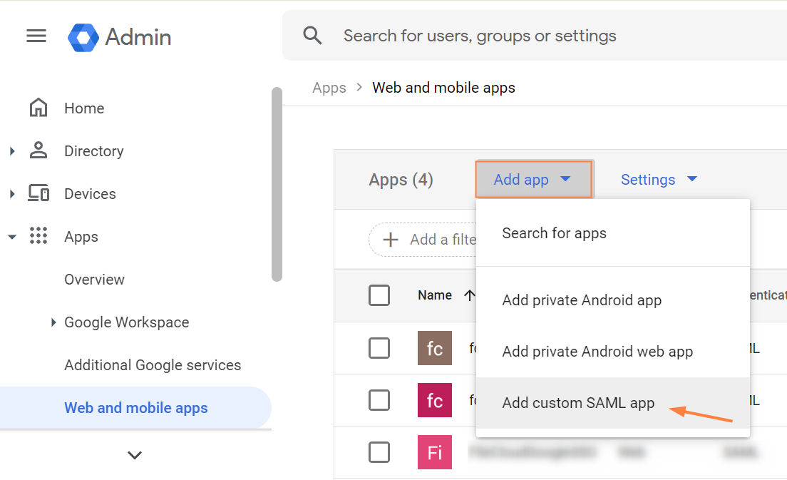 - Click Add app and choose Add custom SAML app.