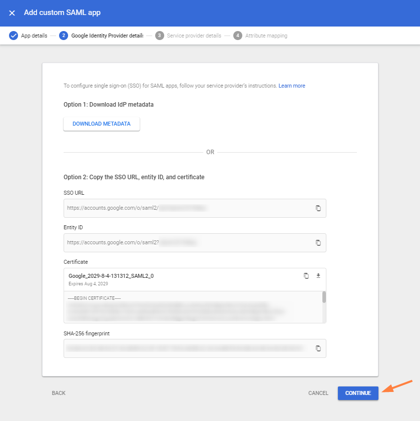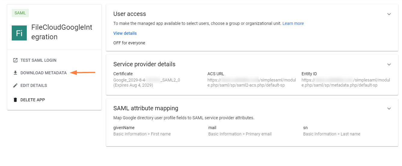 The file GoogleIDPMetadata.xml is automatically downloaded. - Click the copy icon next to Entity ID, and save it.