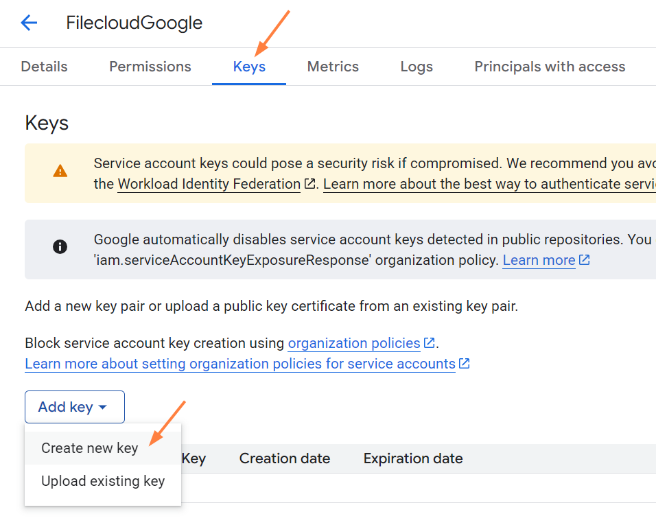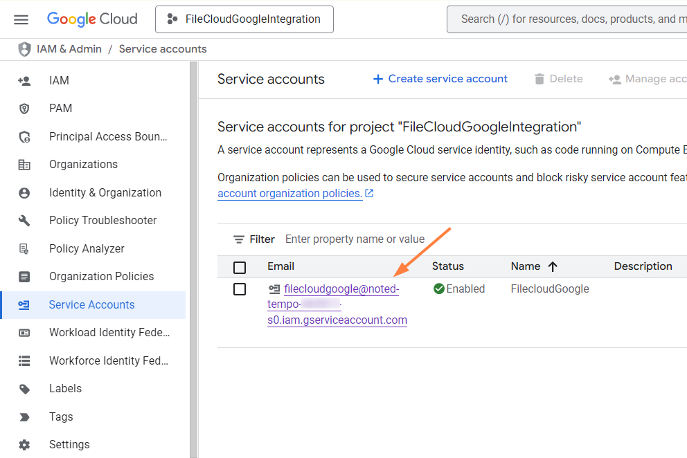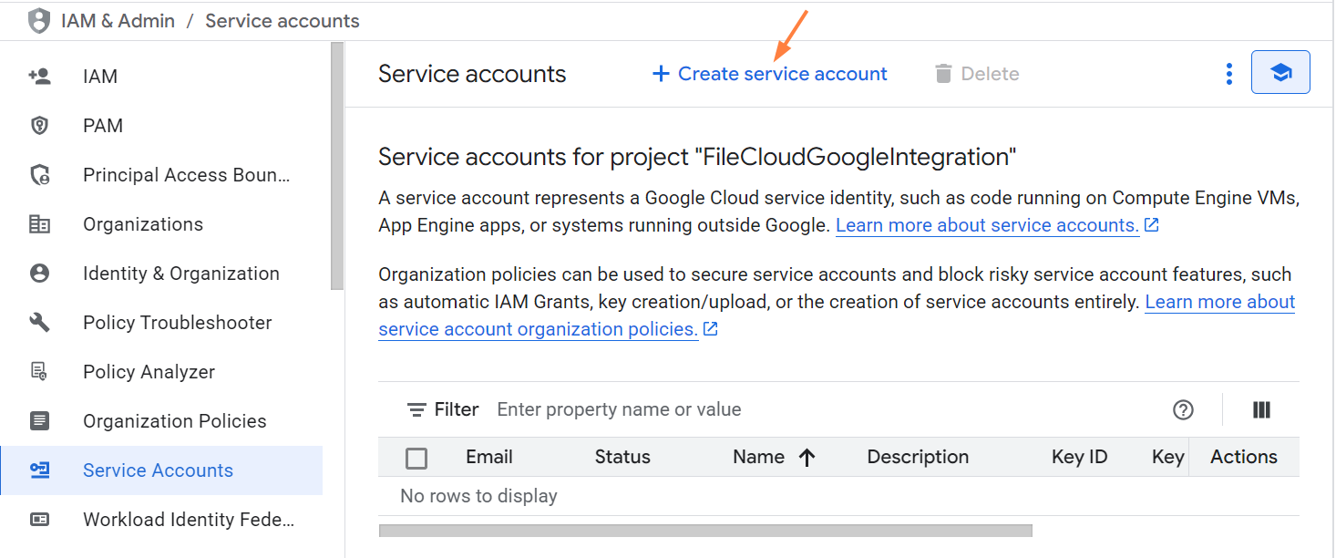 Create a key file and grant FileCloud access to Google