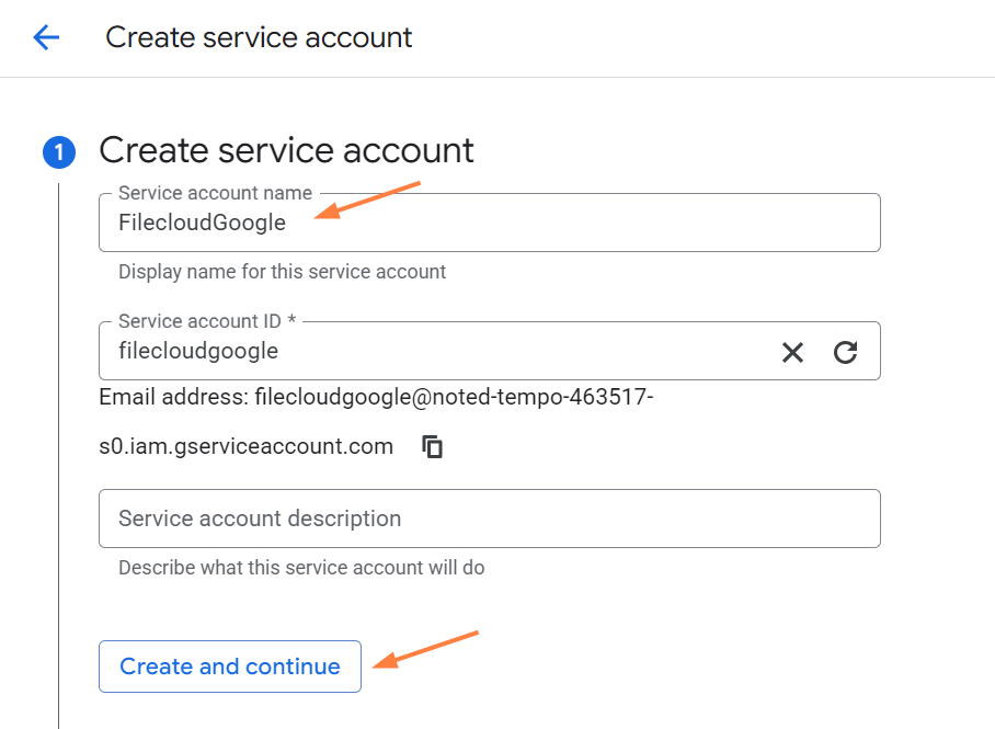 Enter a Service account name and click Create and continue.