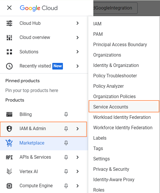 - In the left navigation pane, go to IAM & Admin > Service Accounts.