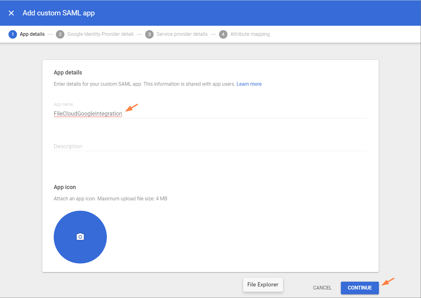 - Fill in the fields as follows, replacing your-domain.com with your FileCloud domain. Click CONTINUE.
